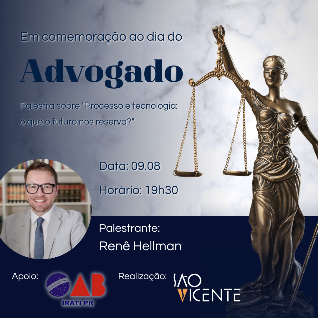 Em comemoração ao dia do Advogado, a Faculdade São Vicente de Irati, com o apoio da OAB Subseção de Irati-PR, promoverá palestra com o tema Processo e tecnologia: o que o futuro nos reserva?, a ser ministrada pelo Prof. Renê Hellman.